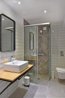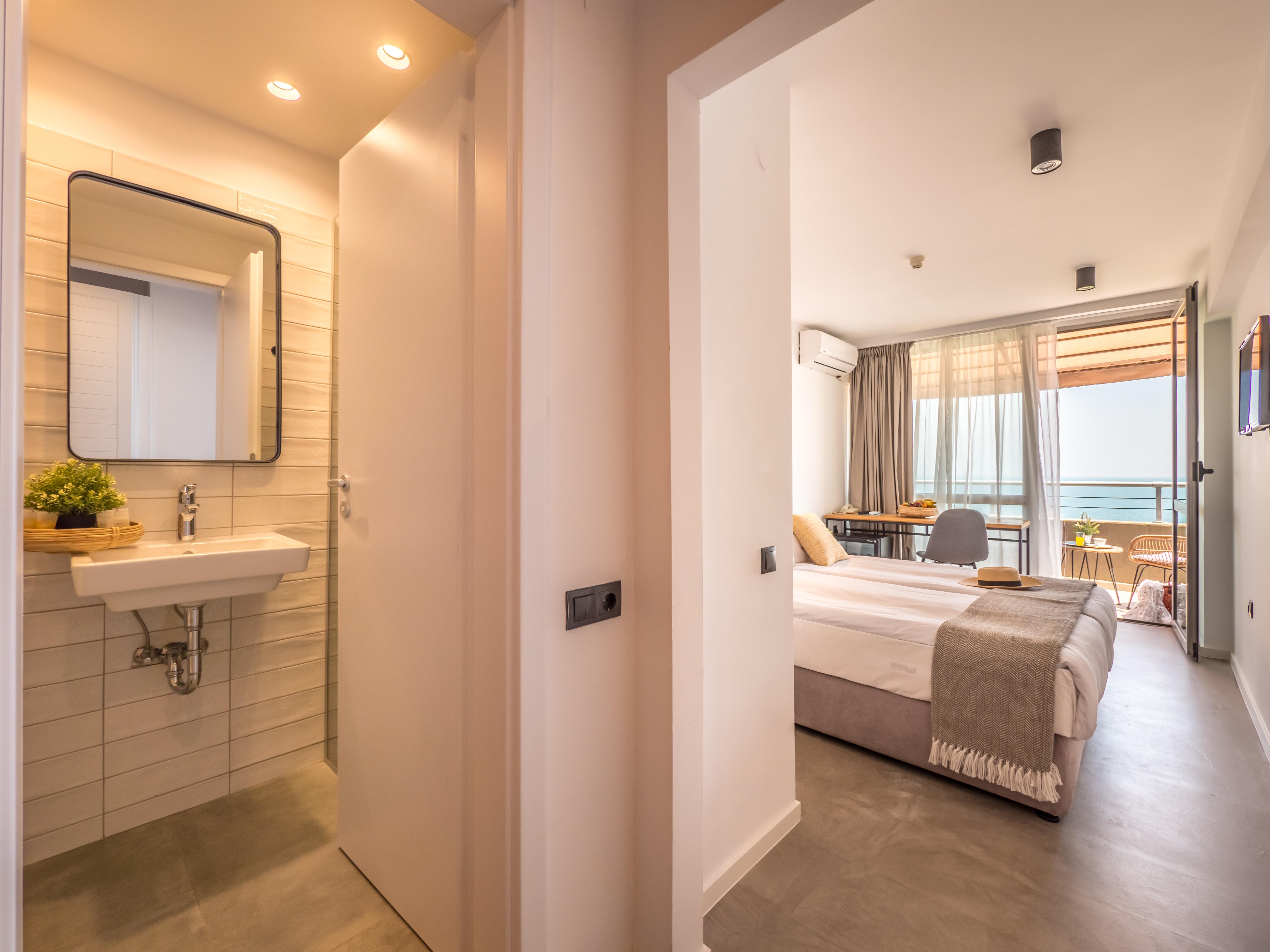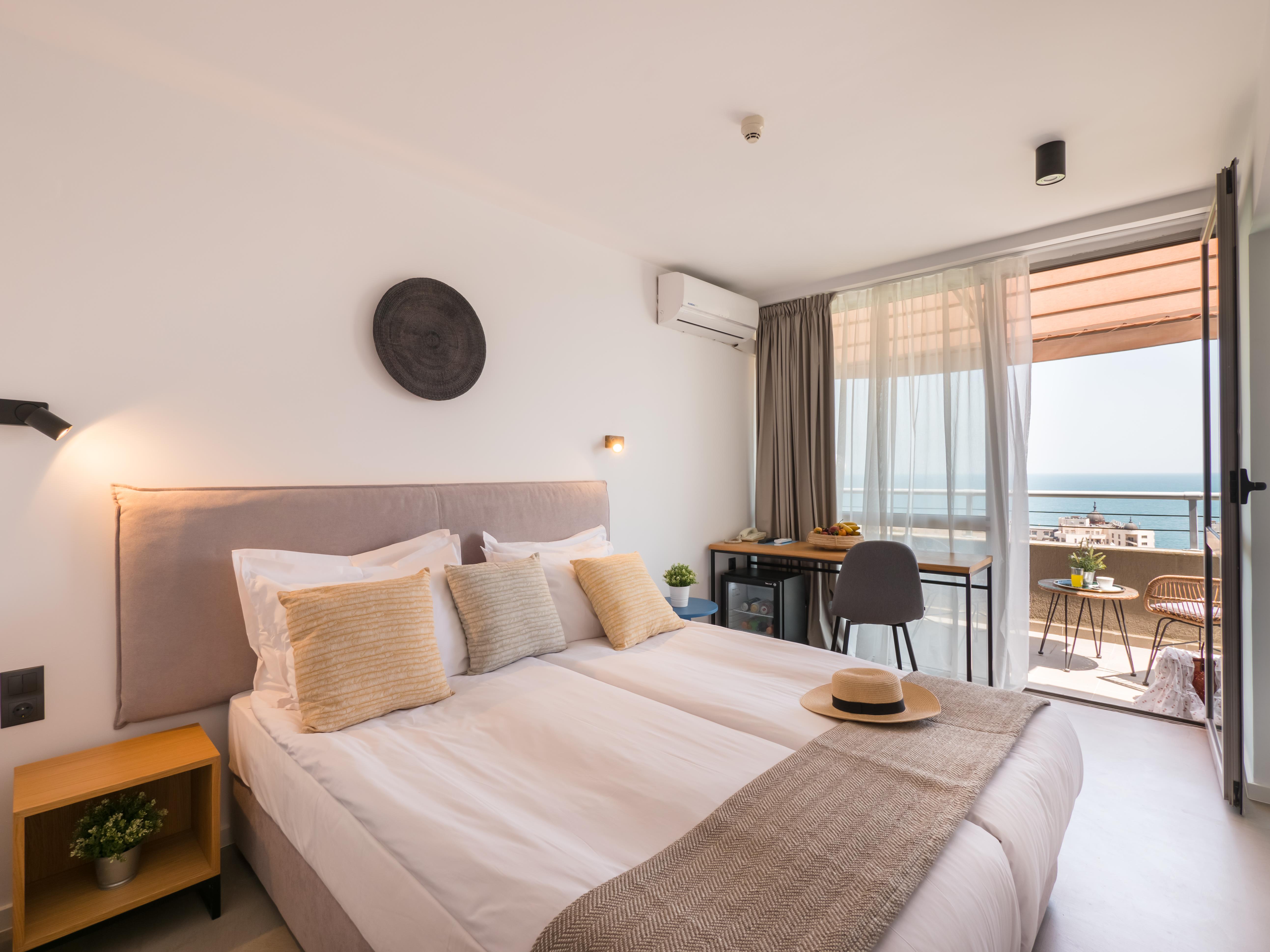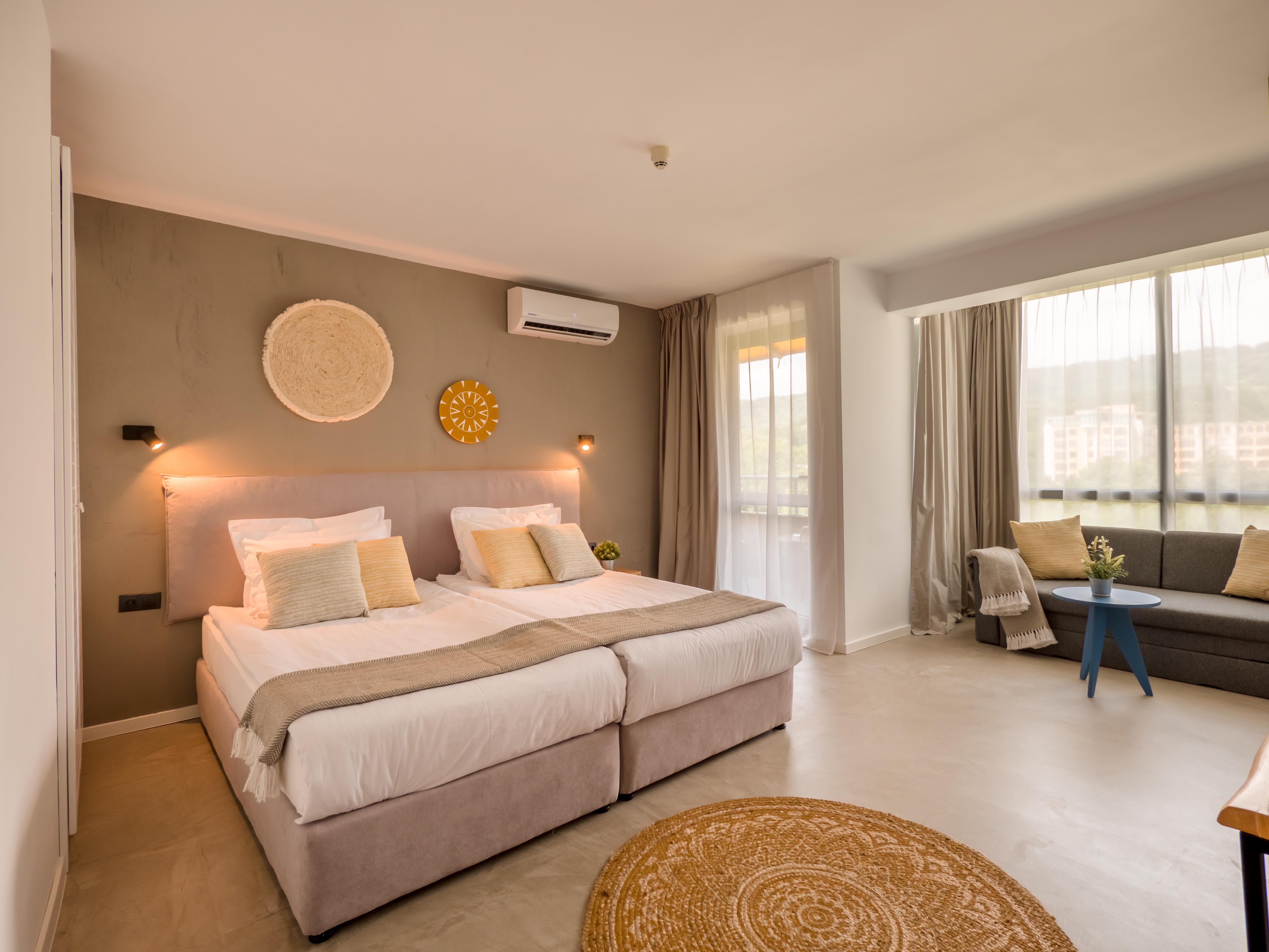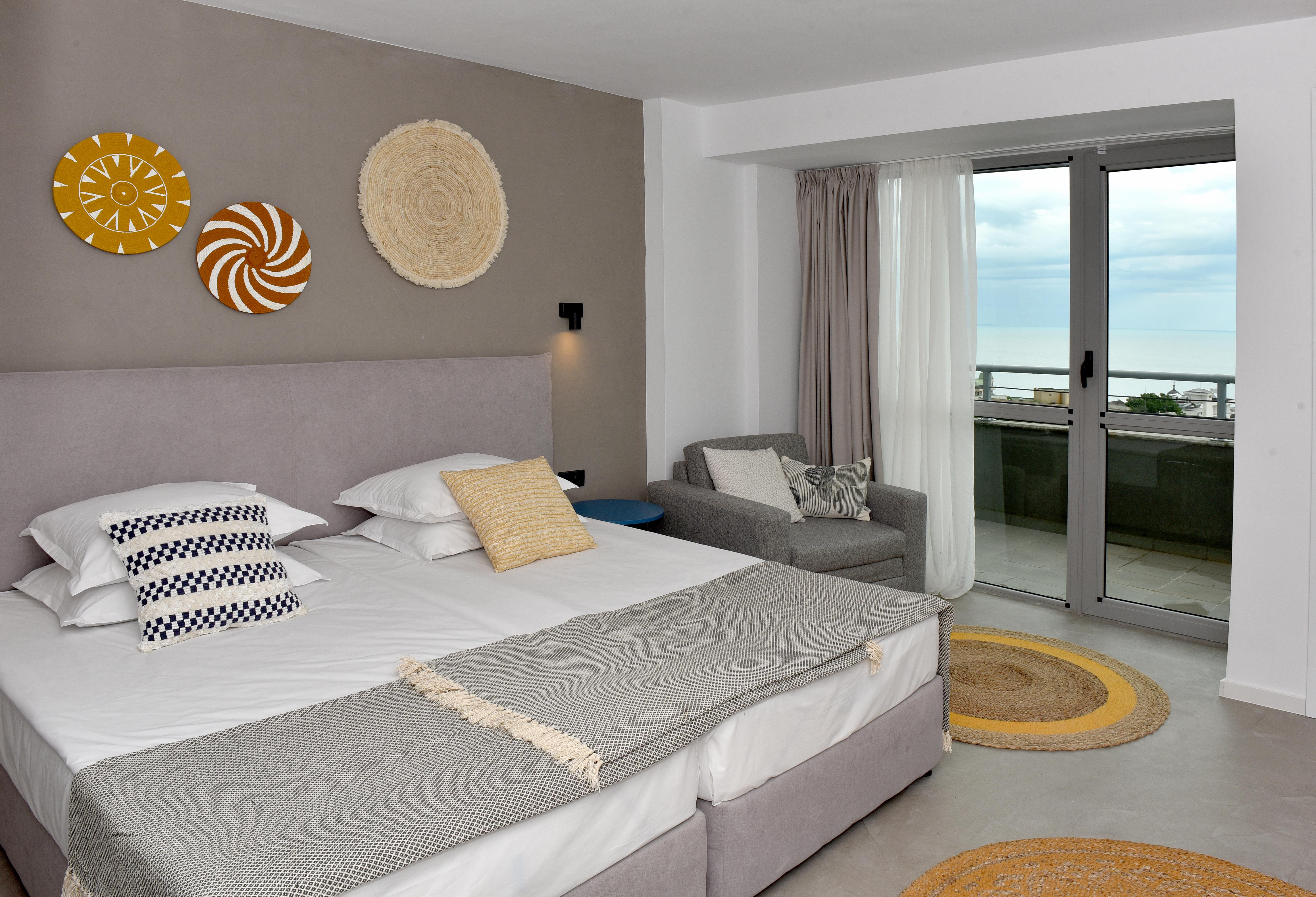 DOUBLE ROOM: o powierzchni ok. 20 m2, przeznaczony dla maksymalnie 3 gości. W pokoju znajdują się pojedyncze łóżka, rozkładany fotel dla dostawki. Widok na morze lub park.