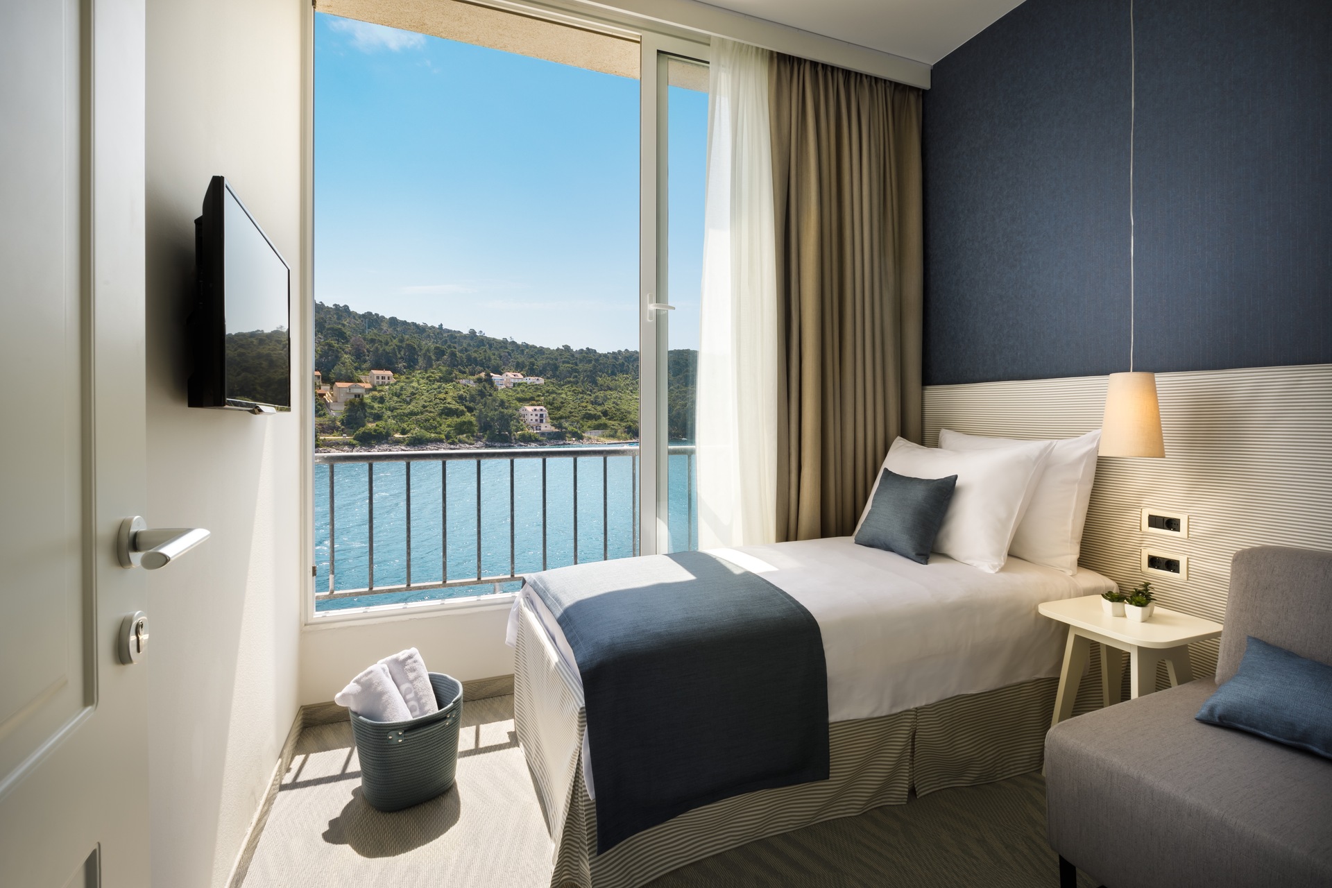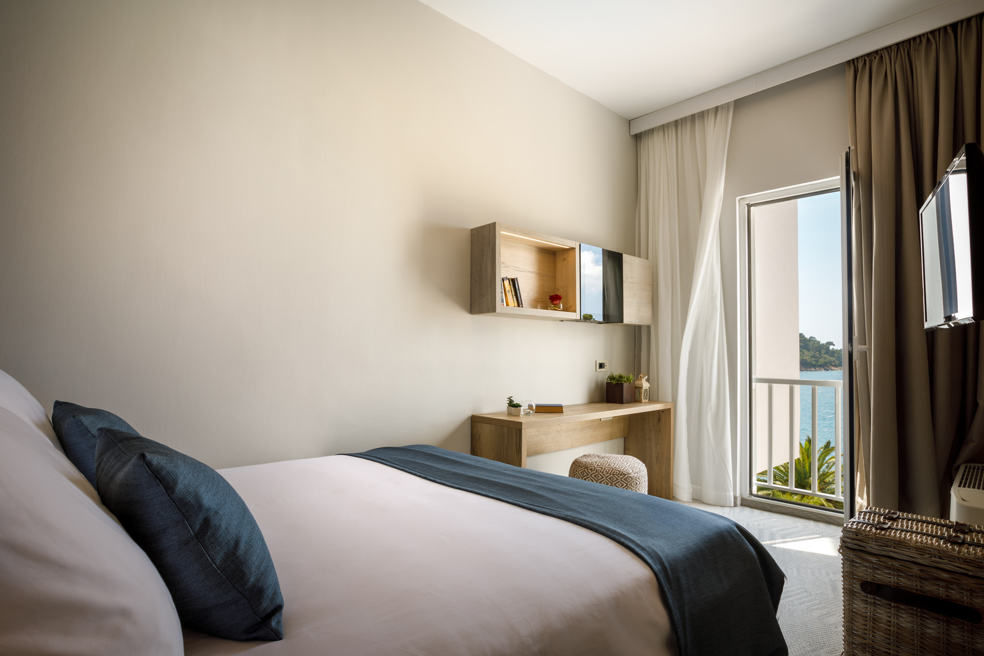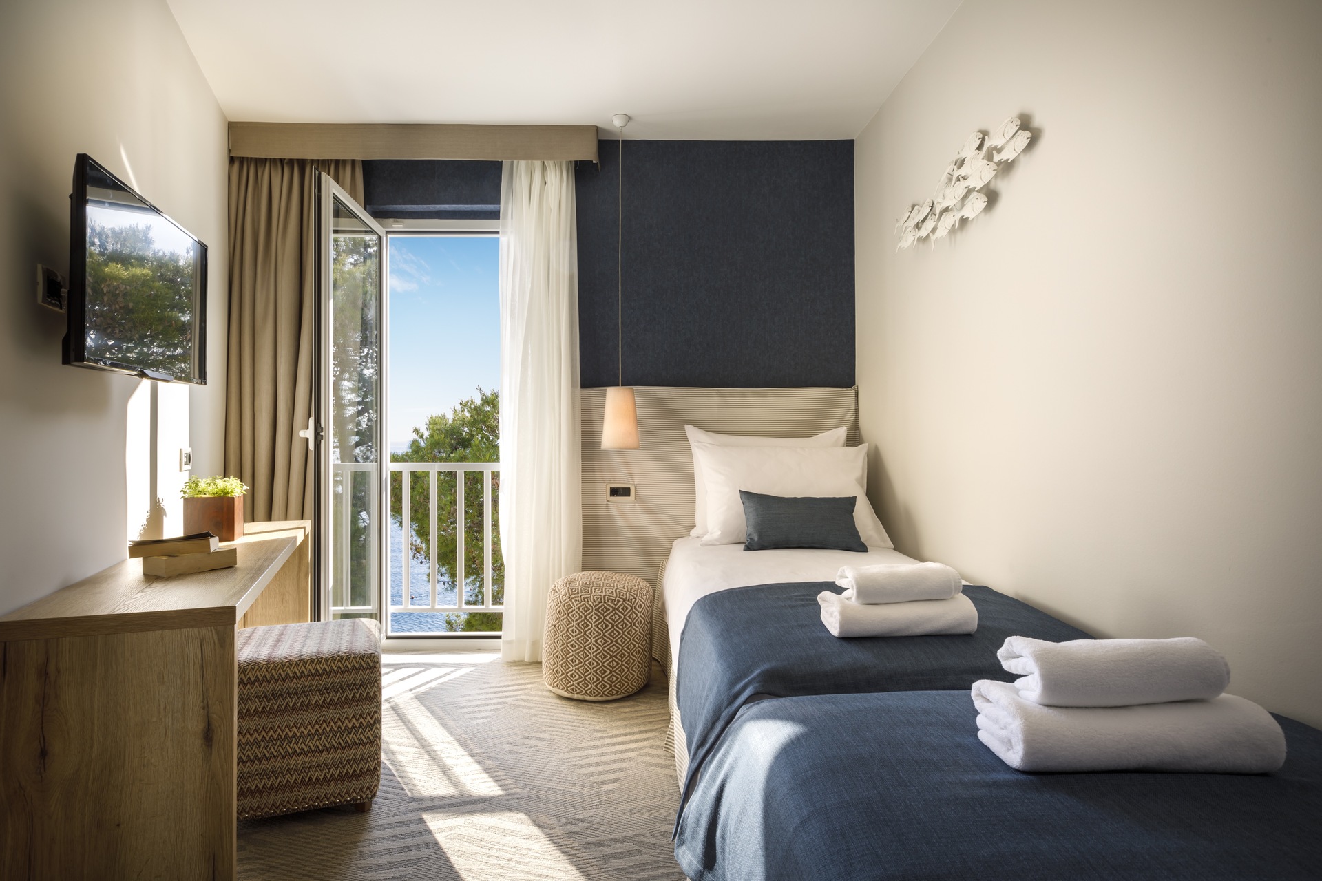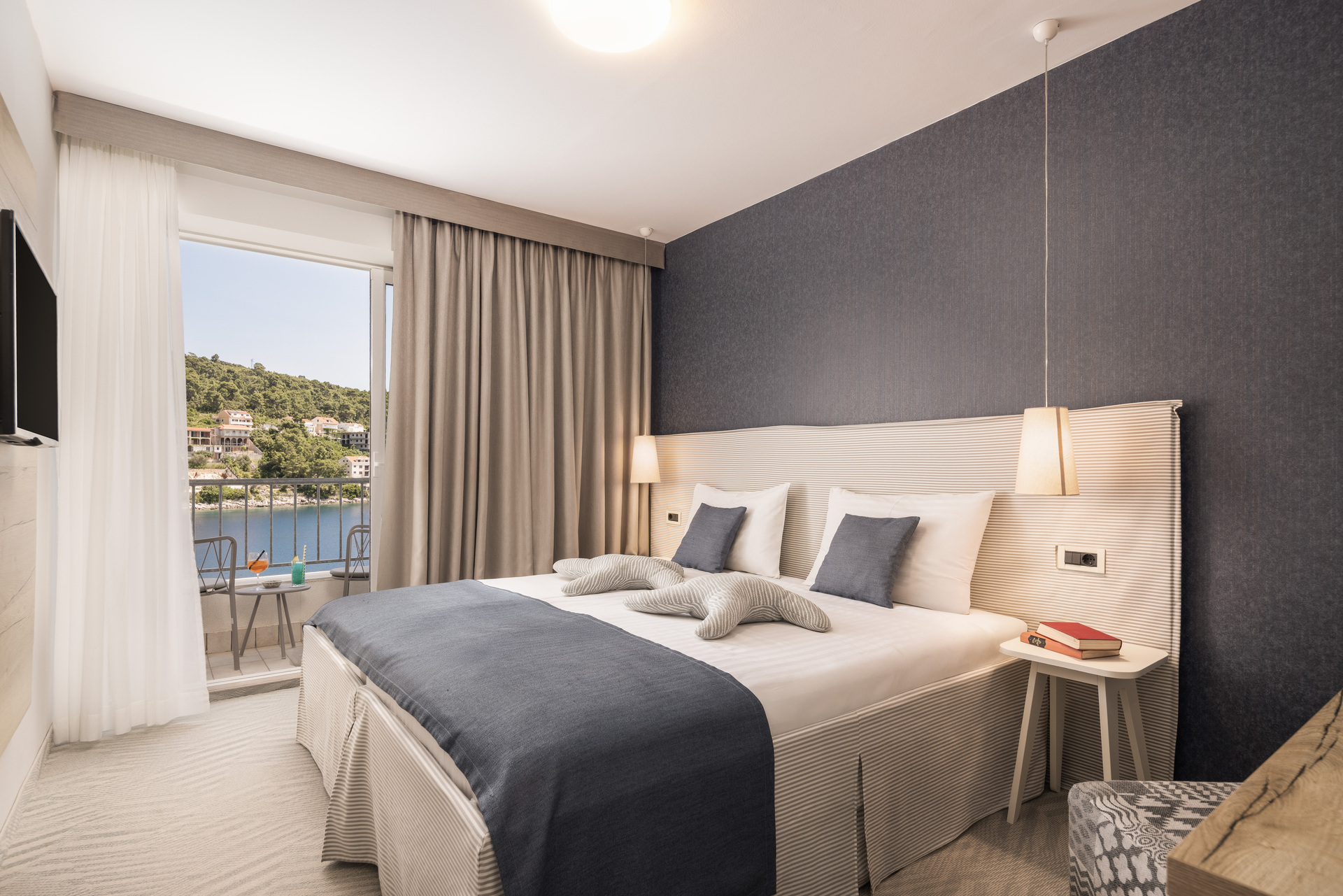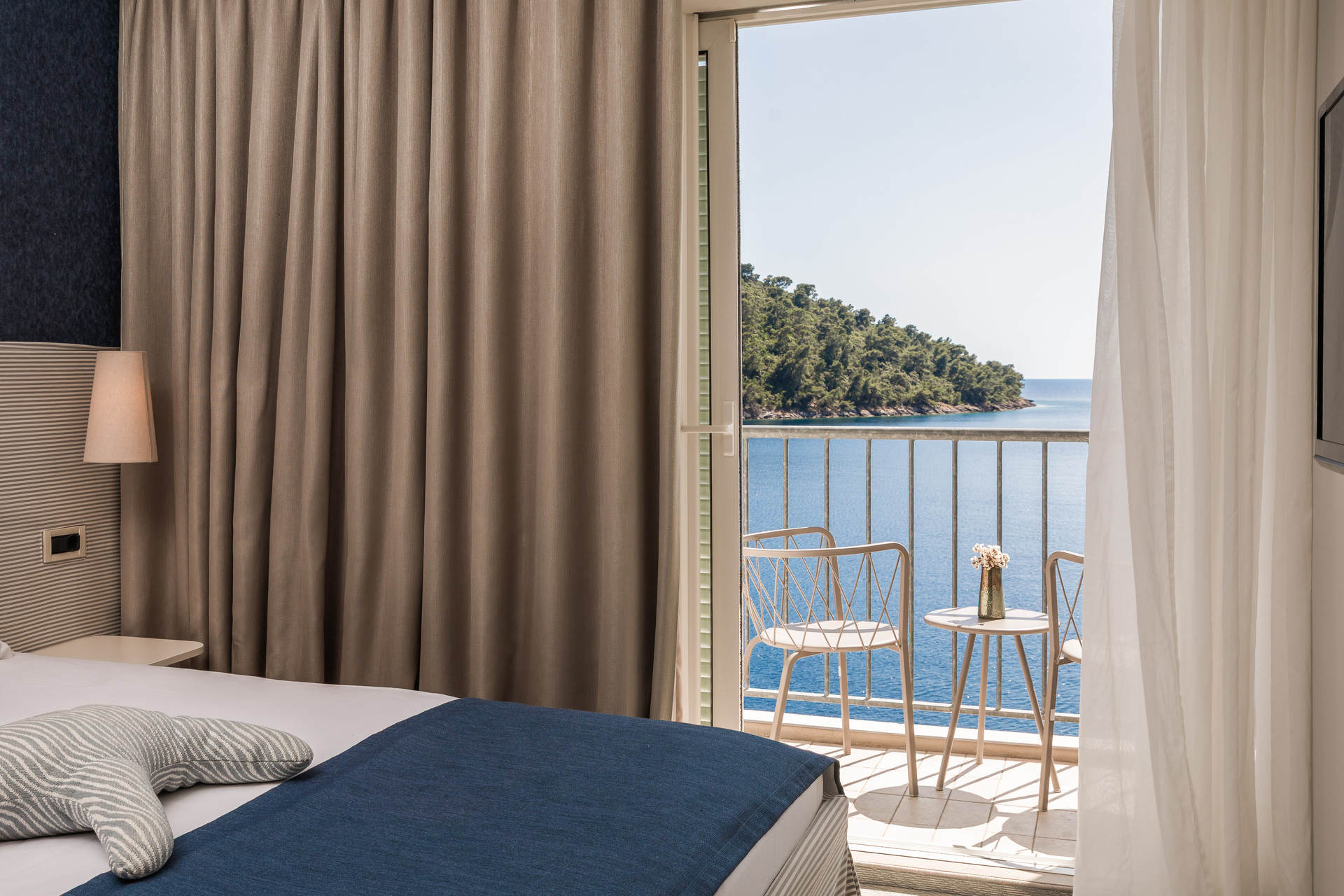 Hotel oferuje nowoczesne pokoje i apartamenty z widokiem na morze lub otaczającą zieleń.
