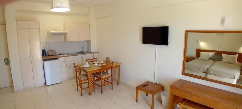 Apartamenty oraz Studio, klimatyzacja, łazienka prysznic lub wanna, w pełni wyposażony aneks kuchenny, sypialnia, TV, telefon, toster, minilodówka