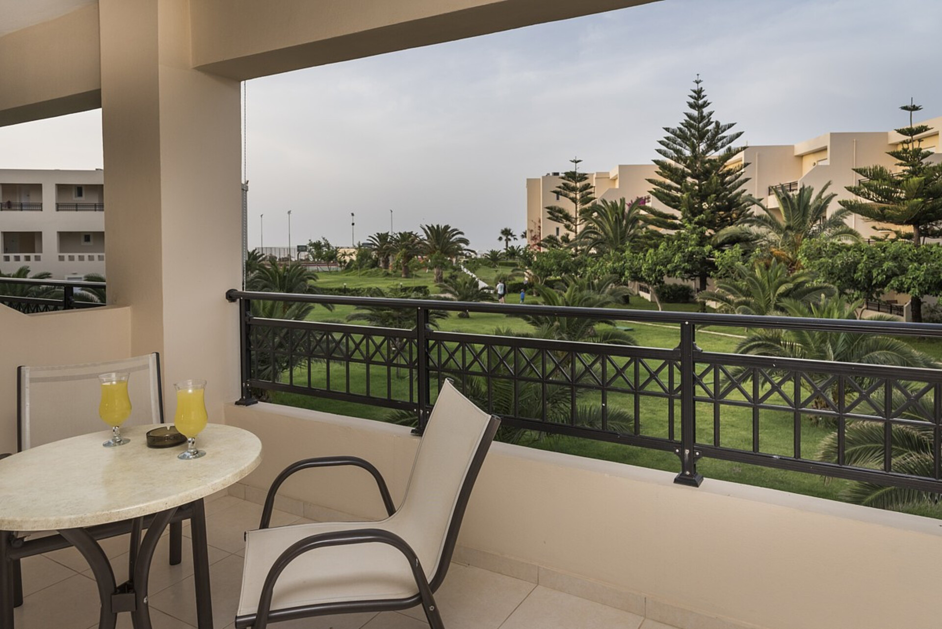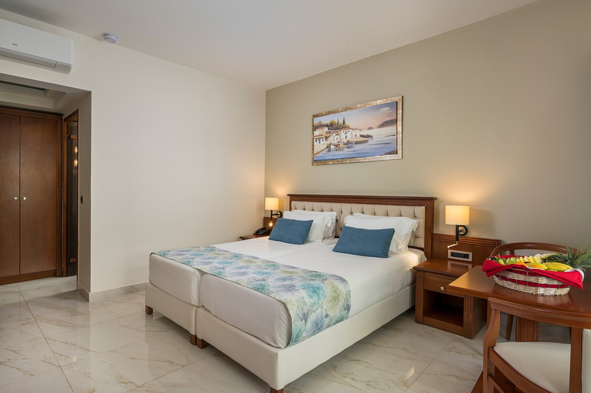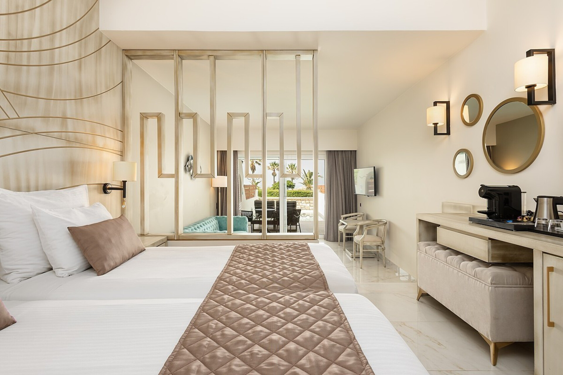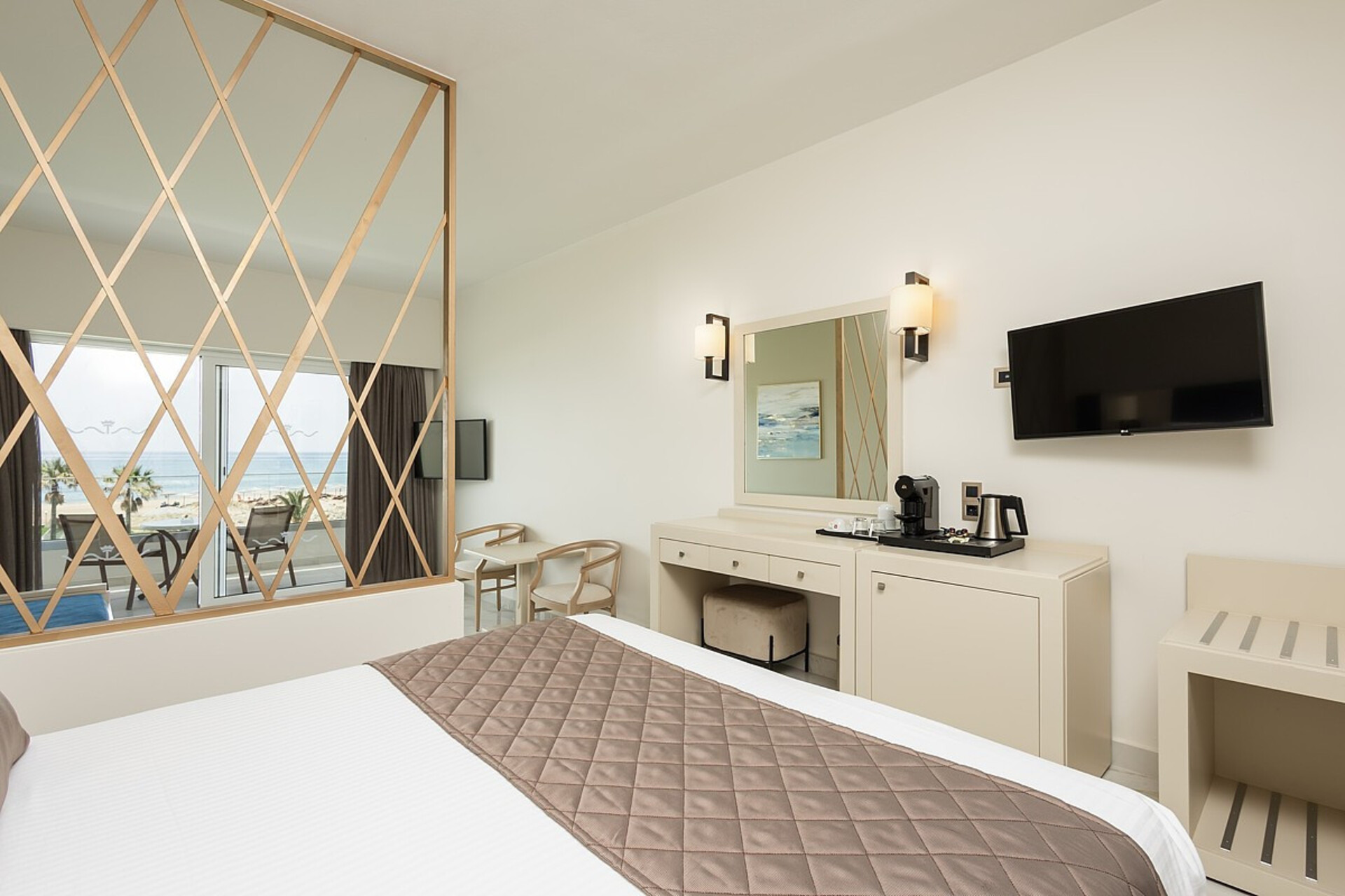 Pokoje są klimatyzowane, wyposażone w łazienkę z prysznicem lub wanną, TV SAT, lodówkę, sejf (dodatkowo płatny), balkon lub taras oraz opcje widoku na ogród lub morze.