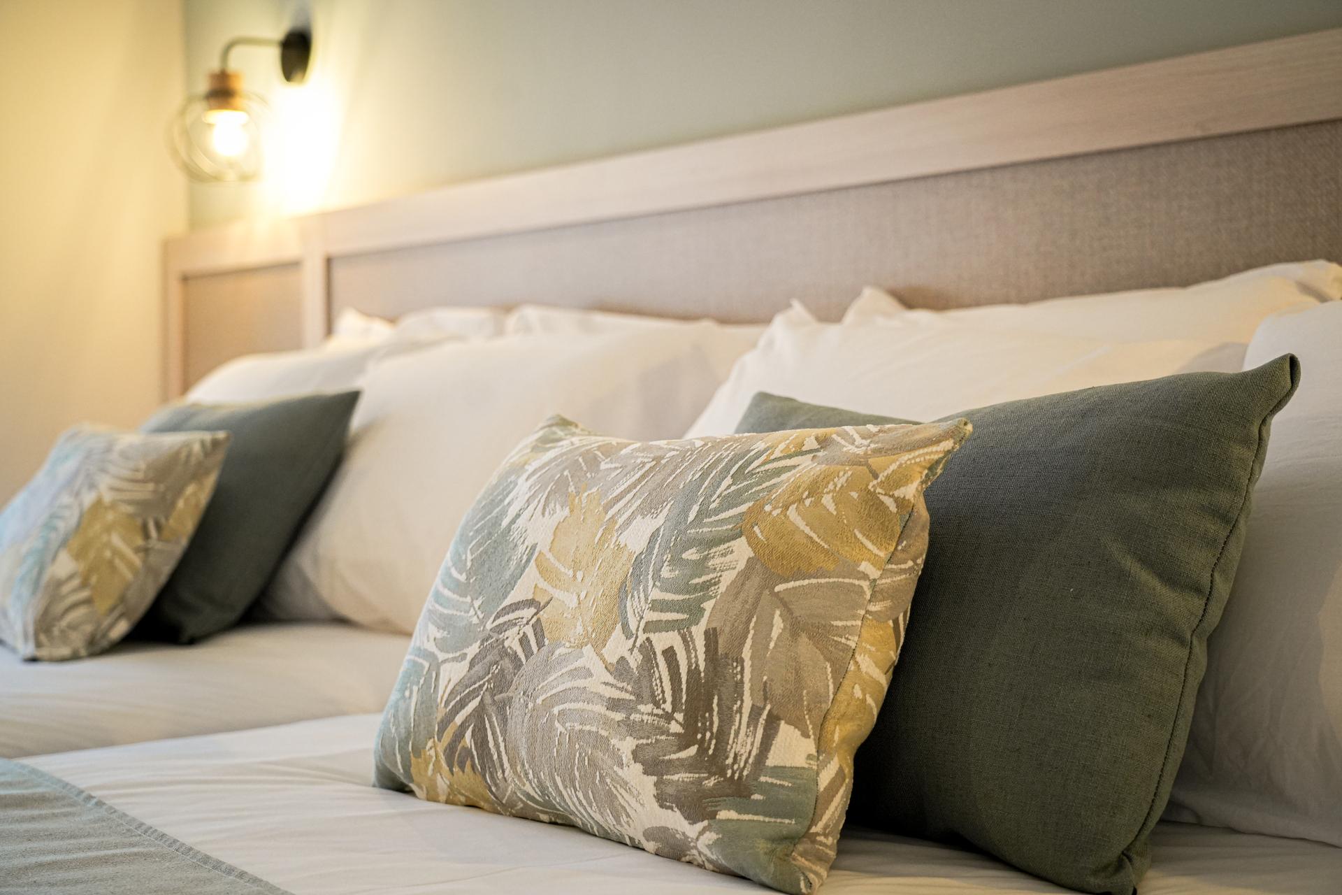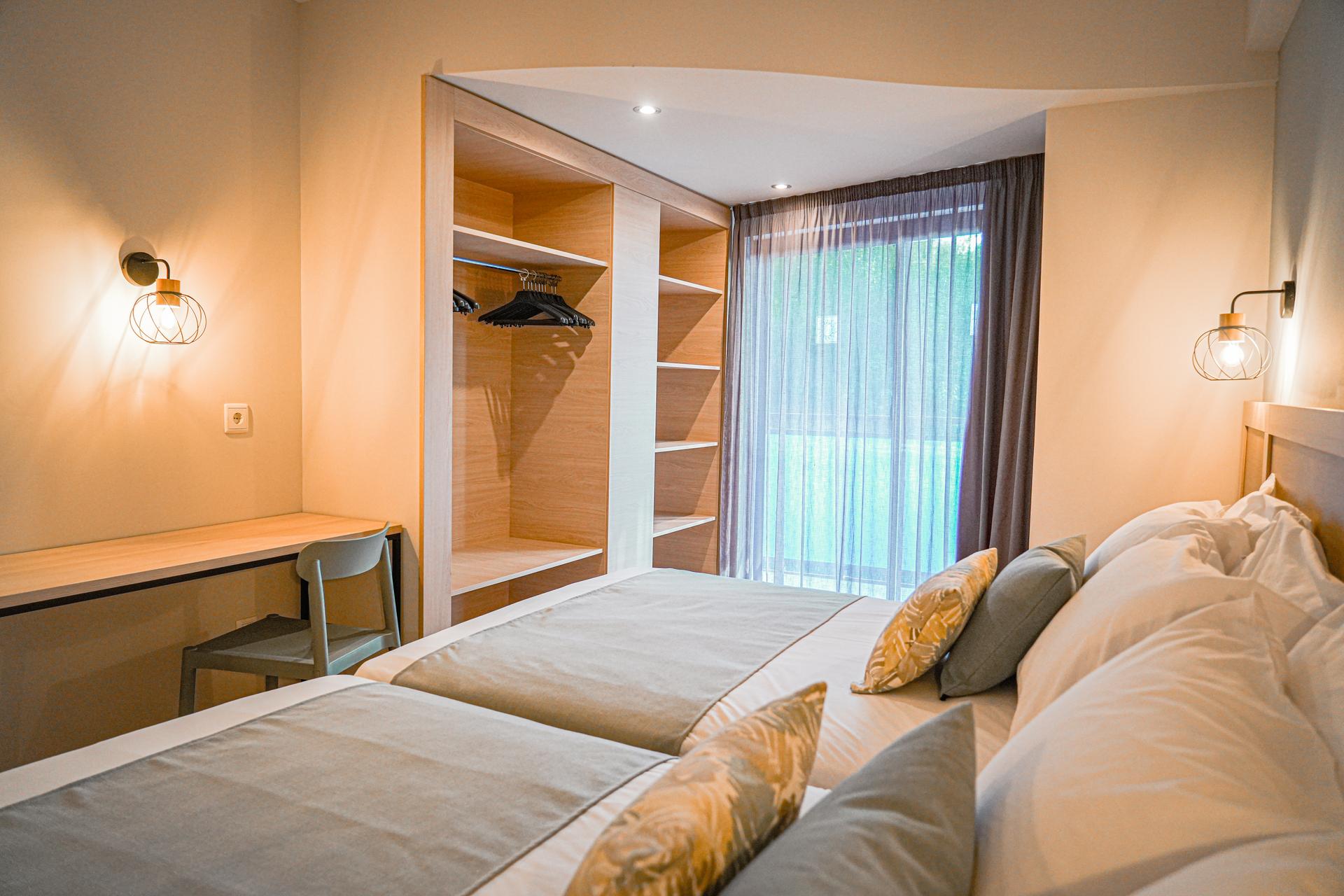 Pokoje zaprojektowane jako komfortowa przestrzeń wypoczynkowa. Wystrój w ciepłych tonacjach, balkon oraz widok na miasto lub basen.