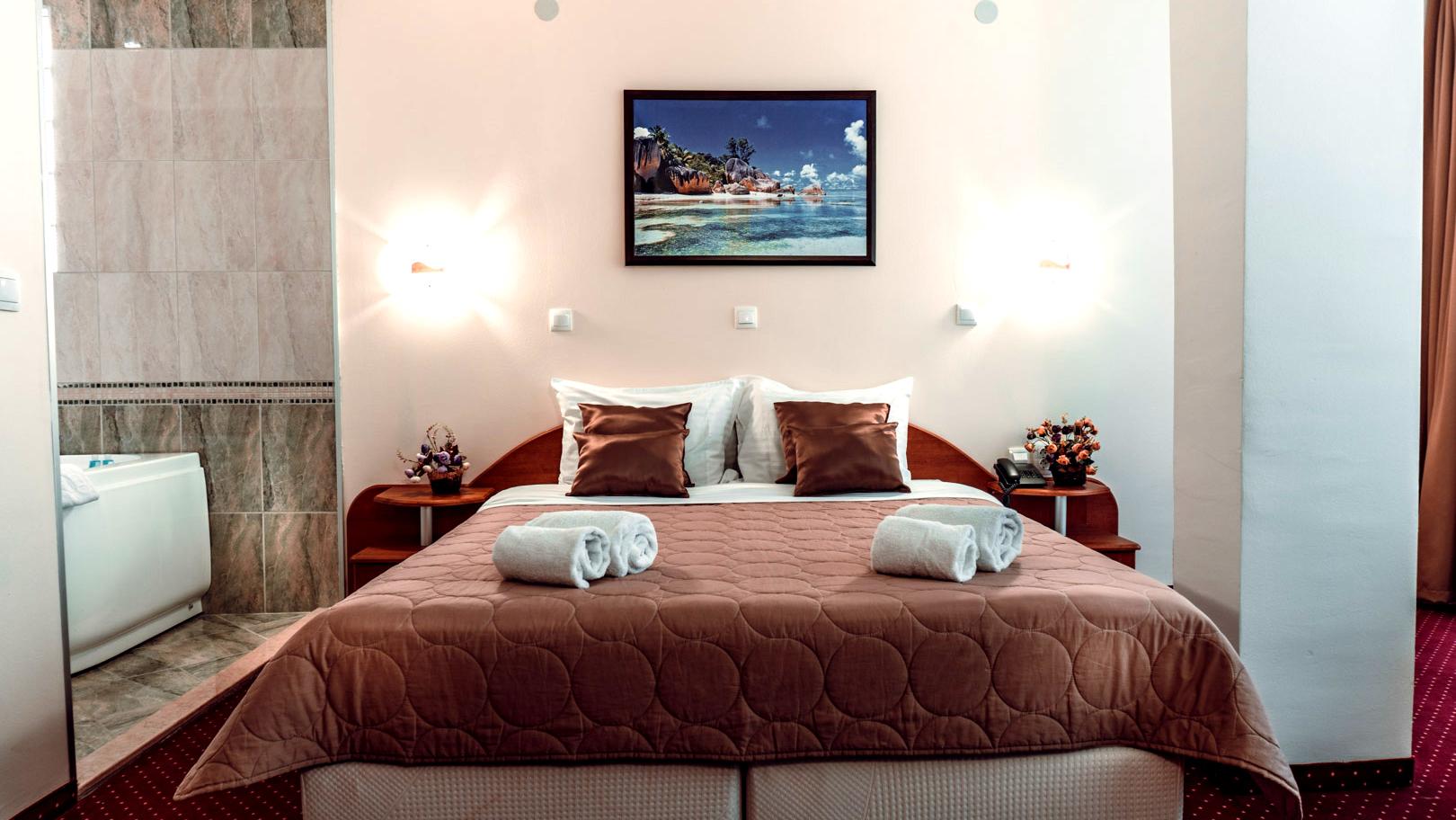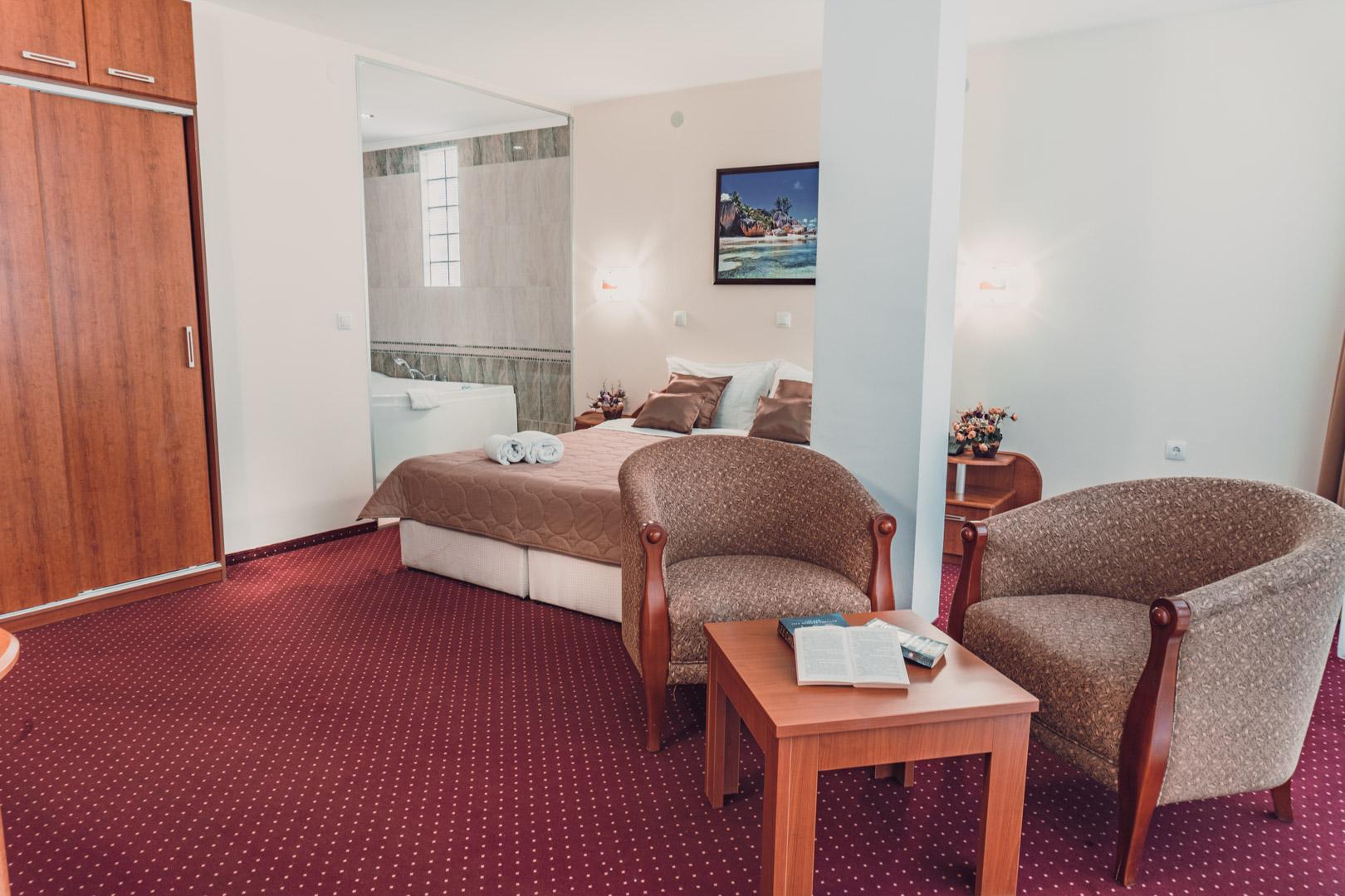 Pokoje i apartamenty wyposażone w klimatyzację, biurko, TV, suszarkę do włosów, małą lodówkę, sejf, Wi-Fi. Pokoje nie mają balkonów. Możliwość zakwaterowania 2,3 i 4 osób. Pokoje dla 4 osób są 1) ze wspólnym spaniem (najmłodsze dziecko śpi razem z rodzicami lub z rodzeństwem na jednej dostawce) lub 2) deluxe z sauną lub jacuzzi (dopłata na miejscu za "podłączenie" - 10 euro za dzień).
