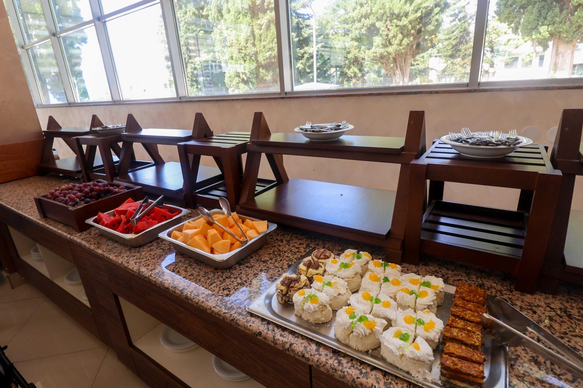 Śniadanie - 07:00-10:00 pieczywo, słodkie i słone wypieki, masło, marmolada, miód, pasty, sałaty, pomidory, ogórki, oliwki, wędliny, sery, parówki, jajka w różnych wariantach, płatki śniadaniowe, owoce