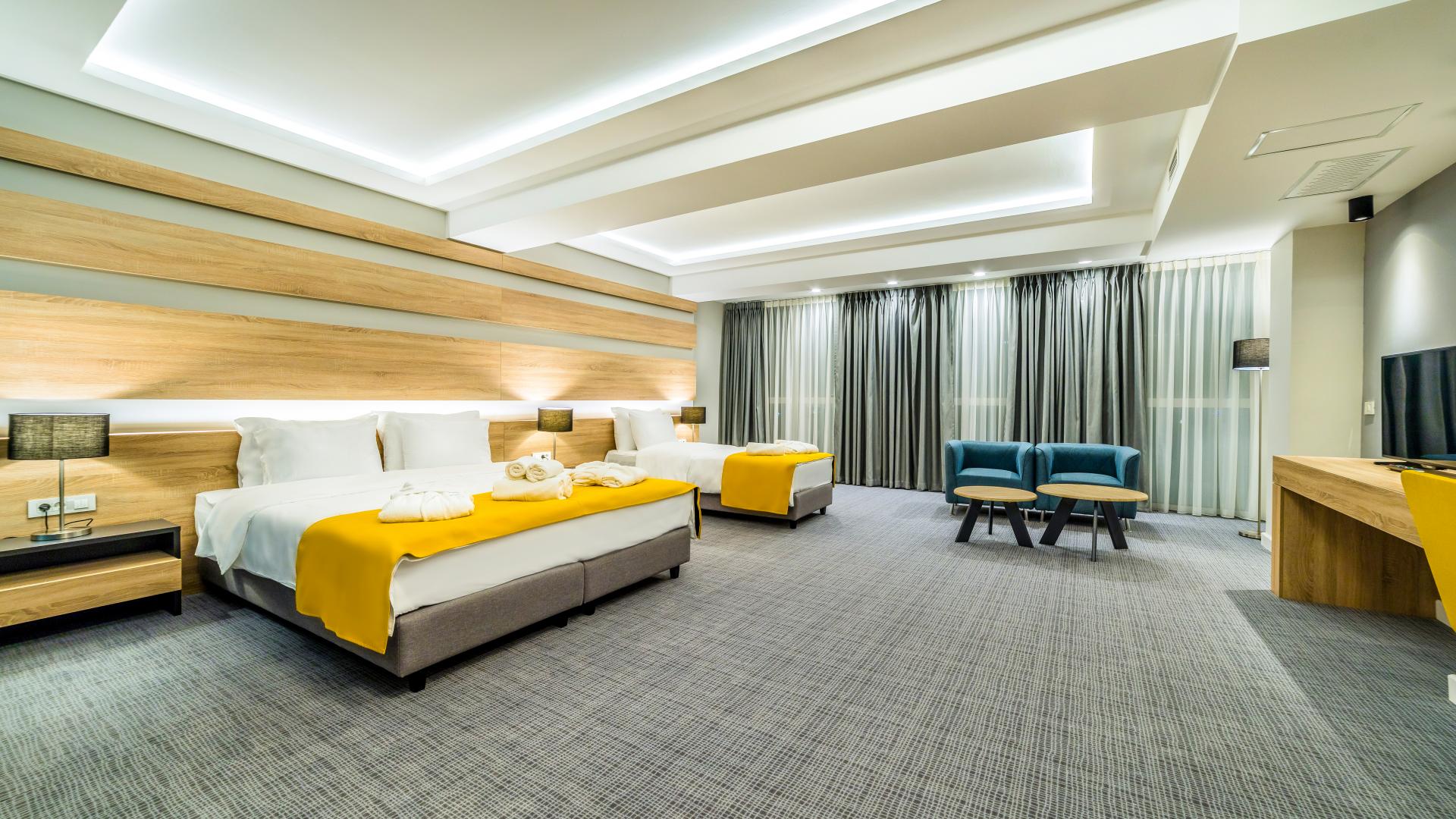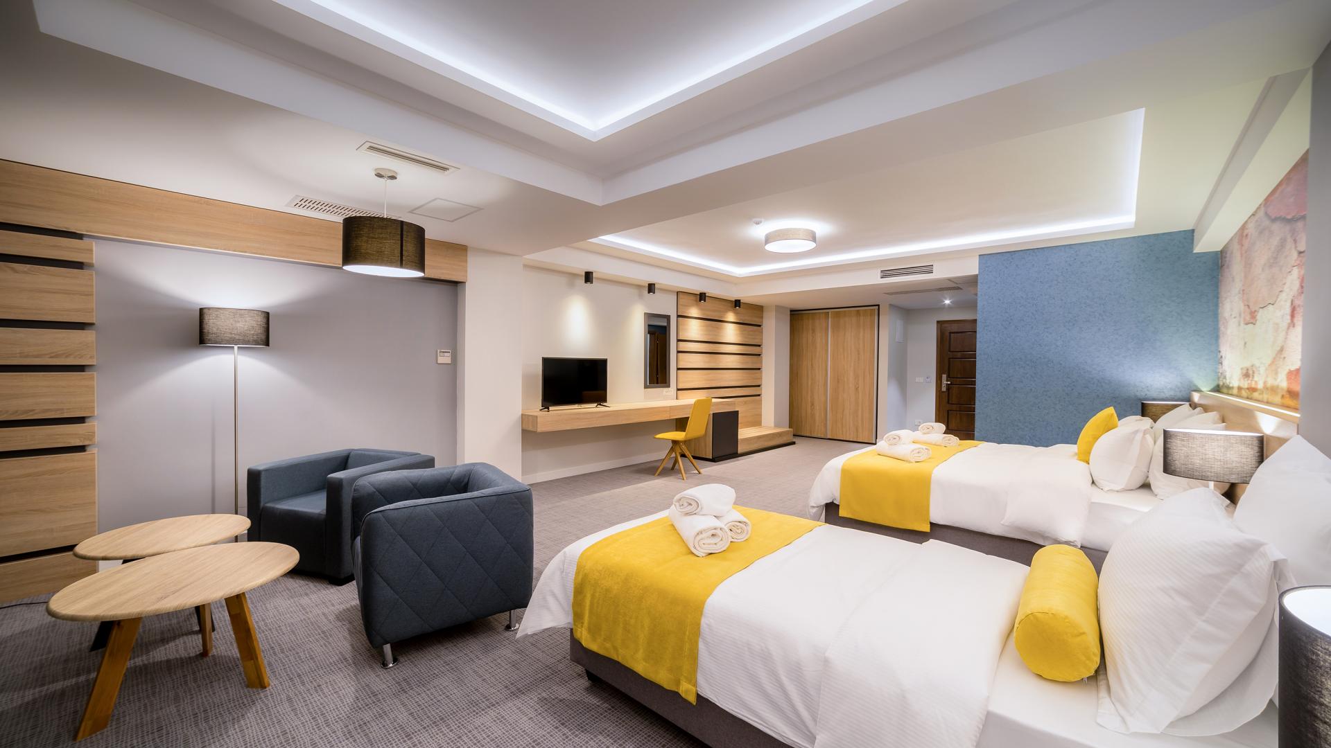 Hotel posiada duże, przestronne pokoje 2-osobowe (DBL bez balkonu) oraz pokoje z możliwością dostawki - superior (ok. 50m2 plus balkon) - rozkładana sofa lub/i pojedyncze łóżko; dwupomieszczeniowe pokoje rodzinne dla 2-6 osób (ok 60 m2) wyposażone w łazienkę, bezpłatną klimatyzację indywidualnie sterowaną, TV/SAT, telefon oraz balkon.