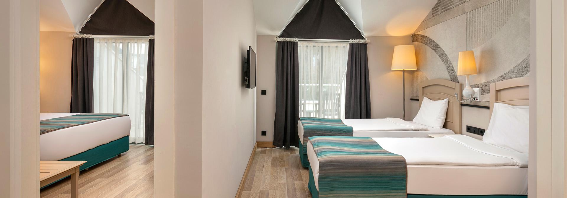 Family Room dla max 4 os, łózko małżeńskie, dwa pojedyńcze łóżka, połączone dwa pokoje,klimatyzacja,łazienka, prysznic lub wanna, suszarka, balkon, biurko, TV, telefon